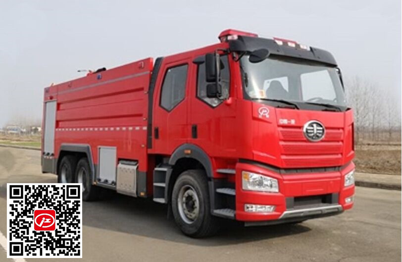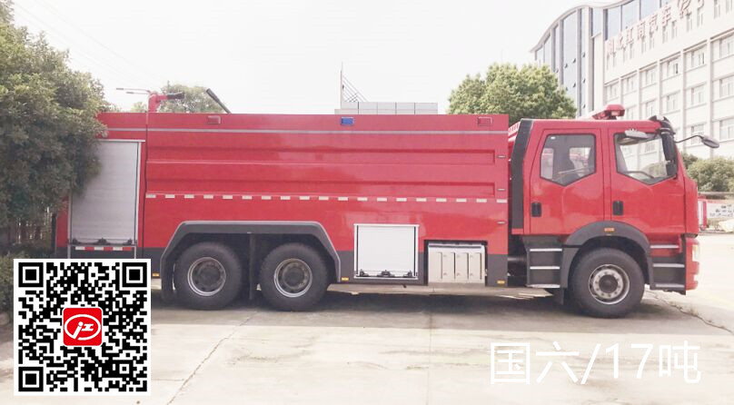 江特牌17噸泡沫消防車采用中國第一汽車集團有限公司生產的CA5350P66K24L5T1E6型消防車二類底盤改裝而成的消防用車。整車由消防員乘員室和車身兩大部分組成,乘員室為單排改雙排,可乘坐2+4人,該車為外露罐結構,車身前部為為罐體,后部為泵房。載液罐體為優質碳鋼,內部噴涂環氧底漆及環氧瀝青漆,與底盤采用彈性連接,載水量14000kg,泡沫液量3000kg,裝備了上海茸申消防設備有限公司生產CB20.10/30.60-RS型中低壓消防泵,額定流量60L/S,車頂安裝成都威斯特消防機械有限公司生產的PL8/48型車用消防炮。該車最大的特點是載液量大、操控性好、維修簡便?蓮V泛應用于公安消防隊、廠礦企業及社區、碼頭等場所,撲救大型油類火災和一般物質火災。
