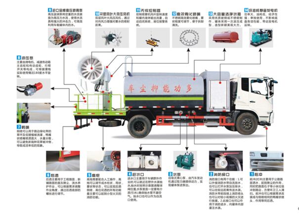 底盤配置:采用東風(fēng)D9系列2315排半寬體駕駛室,選配玉柴200馬力/康明斯210柴油機(jī)器,國六排放標(biāo)準(zhǔn),4500mm軸距,法士特6檔變速箱,4.5噸級前橋/10噸級后橋,295/80R22.5,10.00R20鋼絲胎,方向助力,原裝空調(diào),電動門窗,中控鎖,短氣剎,底盤配置升級,值得期待. 上裝配置:罐體容積12立方,選裝射程60-100米風(fēng)送式霧炮機(jī),罐體鋼板為4mm碳鋼Q235材質(zhì),罐內(nèi)隔板具有防波作用,以減輕汽車行駛時罐體液體沖擊,罐體及整車外形尺寸按照公告。帶大功率專用灑水泵,泵可自吸自排,整車前沖、后灑、側(cè)噴、帶65消防接口,后平臺選配60-100米風(fēng)送式霧炮機(jī)組;汽油或柴油發(fā)電機(jī)組;遠(yuǎn)程遙控系統(tǒng)控制;霧炮自動旋轉(zhuǎn)角度0-360°。后平臺帶綠化灑水炮,水炮揚(yáng)程≥25米,灑水炮可全方位旋轉(zhuǎn),可連續(xù)調(diào)成直沖狀、大雨、小雨、毛毛雨;前封頭帶水位計,后平臺主管路帶1寸澆花接口,后爬梯。平臺后部帶小安全告知牌:“隨時停車,注意安全”,帶兩根水管及陰陽端。罐體顏色:上白/下藍(lán),銀灰/銀藍(lán),罐體兩側(cè)噴“多功能抑塵車”字樣,貼反光標(biāo)示。