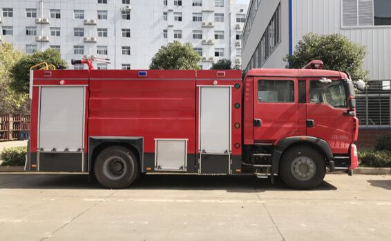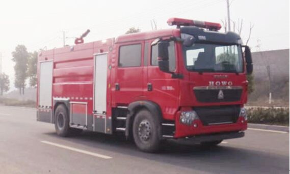 重汽T5G消防車整車動力性能優越,穩定可靠,技術先進,反應快速,操作簡便,器材配置齊全,具備全套消防功能,經濟性、舒適性均達國際先進水平,安全性、可靠性與國際接軌,是消防隊常備的消防車輛。車上除了裝備消防水泵及器材以外,還設有大容量的貯水罐及水槍、水炮等,可將水和消防人員輸送至火場獨立撲救火災。它可由消防栓直接供水,也可以從水源吸水直接進行撲救,或向其他滅火噴射裝置供水,整車由消防員乘員室和車身兩大部分組成,乘員室為單原廠雙排座,可乘坐2+4人,該車為外露罐結構,車身前部為器材箱,中部為水罐,后部為泵房。載液罐體為優質碳鋼,內部噴涂環氧底漆及環氧瀝青漆,與底盤采用彈性連接,載水6000kg(PM80)/8000kg(SG80),泡沫液量2000kg(PM80),裝備了上海雄真消防設備有限公司生產CB10.60型中低壓消防泵,額定流量60L/S,車頂安裝成都威斯特消防機械有限公司生產的PL48(PM80)或PS60W(SG80)型車用消防炮。該車最大的特點是載液量大、操控性好、維修簡便。可廣泛應用于公安消防隊、廠礦企業及社區、碼頭等場所,撲救大型油脂類火災和一般性物質火災。
