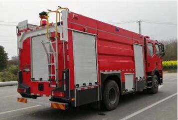 上裝配置:該車采用內藏式罐體結構,車身前部為水罐+器材箱,后部為泵房(泵房與器材廂采用九簾門布局)。載液罐體為優質碳鋼,與底盤采用彈性連接,罐體總容量8000L,裝備了上海雄真消防設備有限公司生產CB10/60-RS型低壓消防泵,額定流量60L/S,車頂安裝成都威斯特消防機械有限公司生產的PS60W型車用消防炮。該車特點是機動靈活、操控性好、維修簡便。